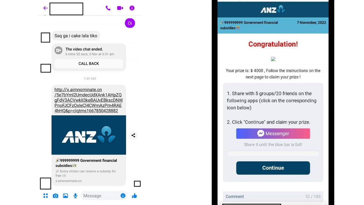 ANZ Regional Executive Pacific, Sarah Stubbings says just one example is a message on Facebook Messenger that appears to be ANZ branded, claiming to contain a link to a promotion to win $4,000.