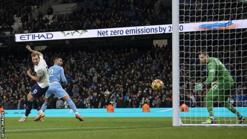 Harry Kane's stoppage-time goal gave Tottenham a stunning 3-2 victory over English Premier League table leaders Manchester City at Etihad Stadium.