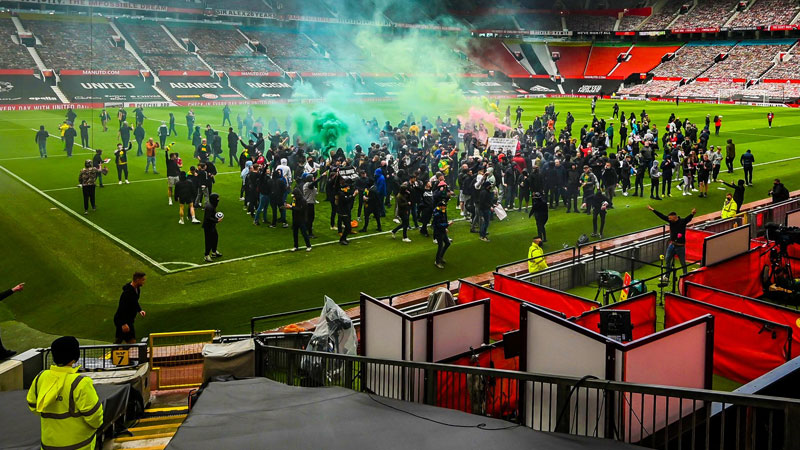 Manchester United's English Premier League game against Liverpool has been postponed after about 200 fans broke into Old Trafford to protest against the Glazer family's ownership of the club.