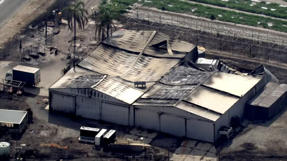 Aerial vision shows a number of houses and sheds in the area badly damaged, and farm machinery burned.