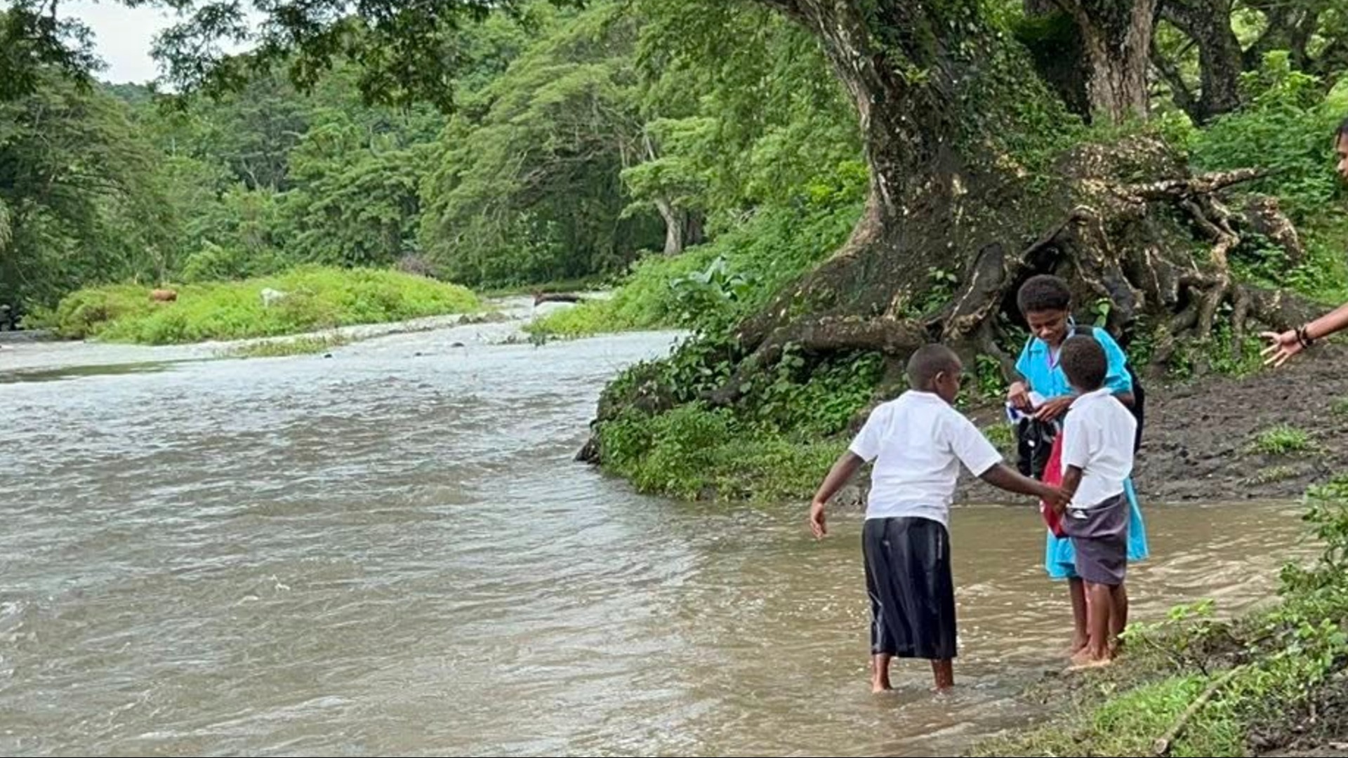 Tuidamudamu explains that the situation in the highlands is unique as even when it is sunny in Natawa village, rainwater from the higher elevations flows down and floods the area where children usually cross after school.