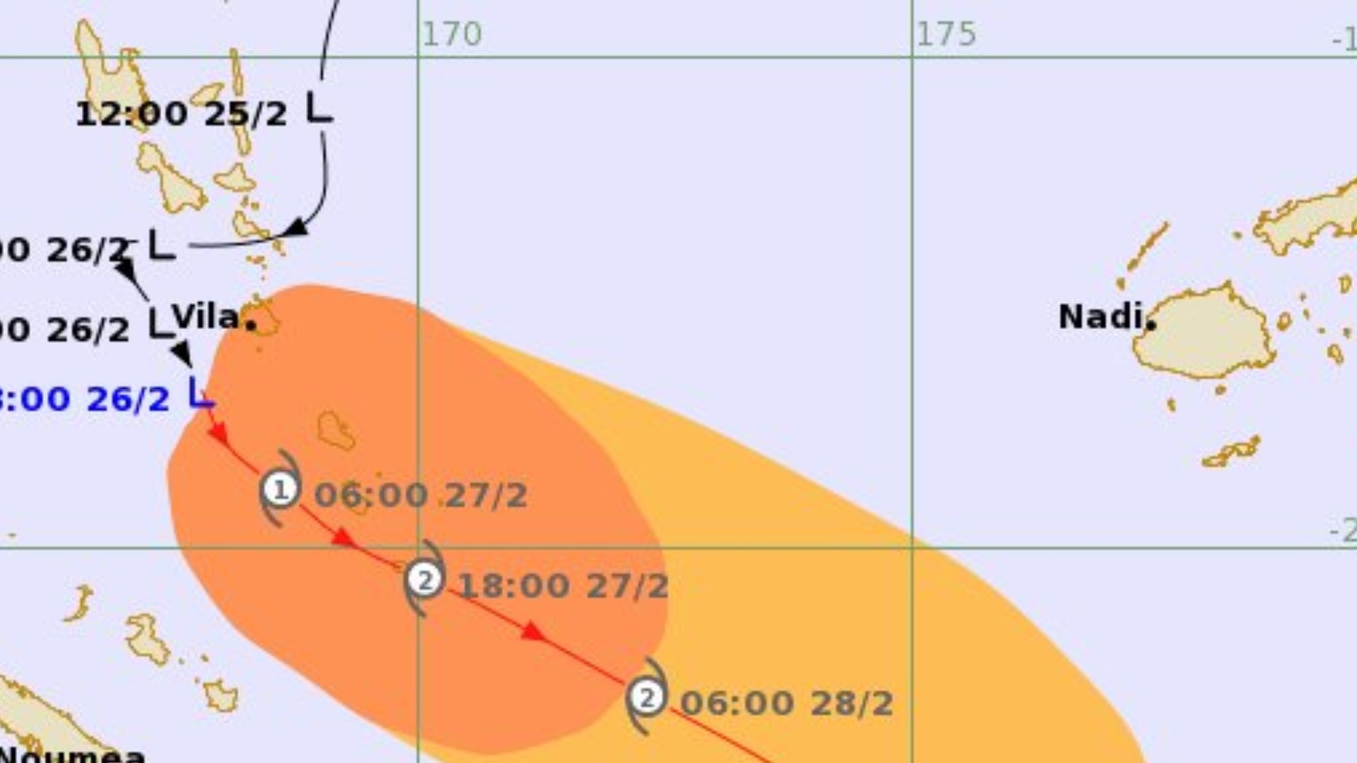 The tropical disturbance which is located about 90 kilometres southwest of Port Vila, Vanuatu, or ab...