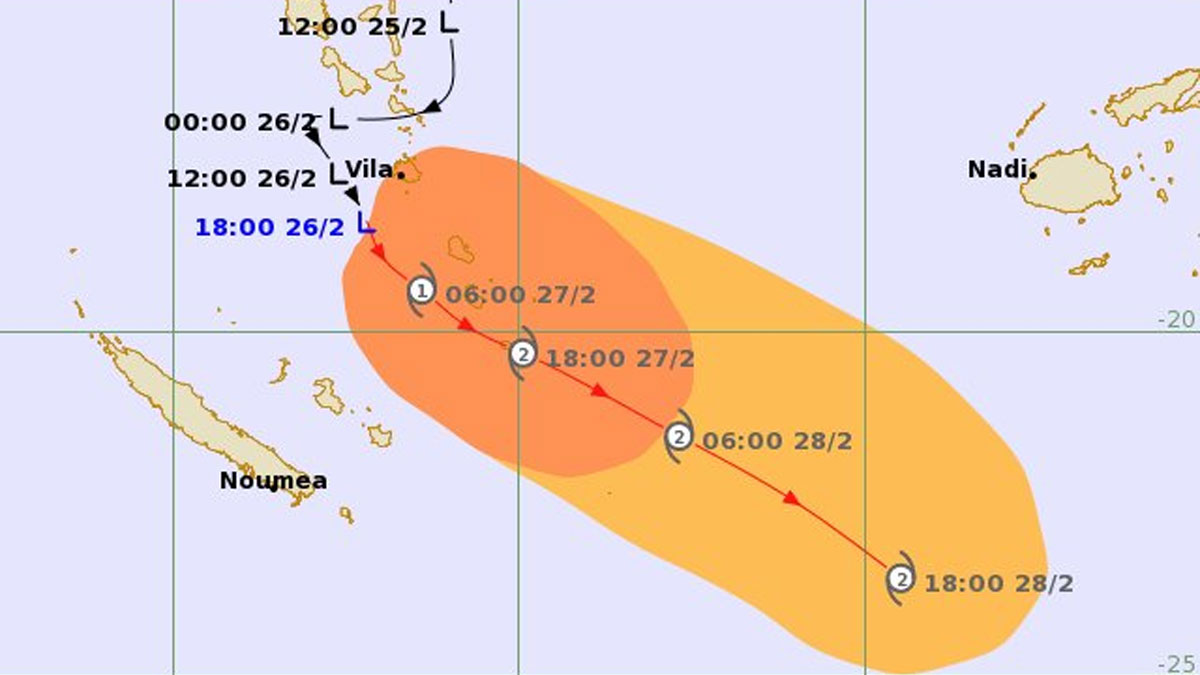The tropical disturbance which is located about 90 kilometres southwest of Port Vila, Vanuatu, or ab...
