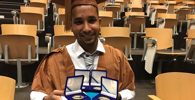 It was a memorable moment for 22‑year‑old Martin Feussner as he won the Gold Medal and the BSP Bank prize for the Vice‑Chancellor and President's Male Graduate with the best combined academic performance and record of service to the community at the USP 2018 Medal and Prizes ceremony.