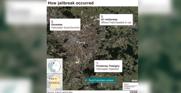 A notorious gangster is on the run after escaping by helicopter from a prison in the Paris region.