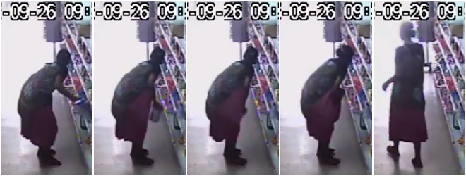 A woman is seen hiding the milk tins under her skirt while her accomplice packed the items in a bag.