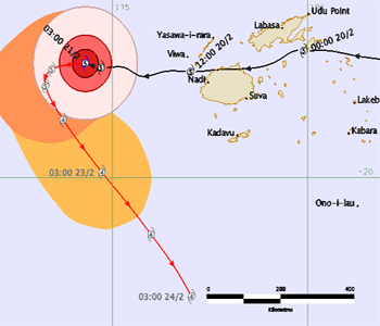 It is still a Category 5 system and was located 220 kilometres west of Viwa Island in the Yasawas at 9am today.