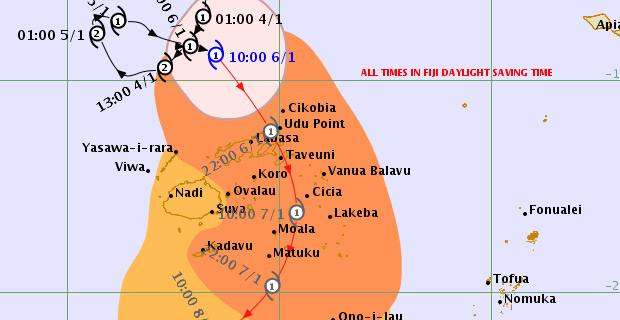 On the forecast track the centre is expected to be located about 50km East-Northeast of Taveuni or about 120km East of Labasa 1am tomorrow.