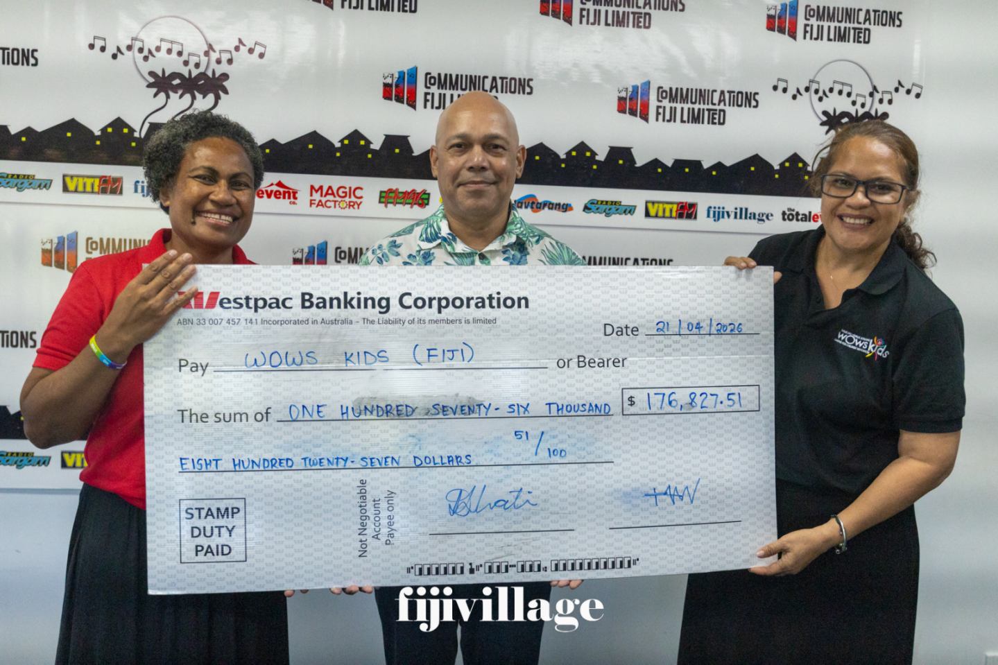 The Communications Fiji Foundation has handed over a cheque of $176,827.51 to the Walk On Walk Strong Kids Fiji this morning following a successful Charity Walk and donation drive.