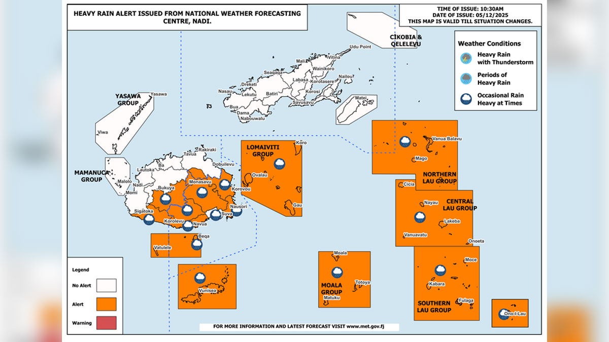 A Heavy Rain Alert is now in force for the southern and eastern parts of Viti Levu, Kadavu and nearby smaller islands, Lau and Lomaiviti