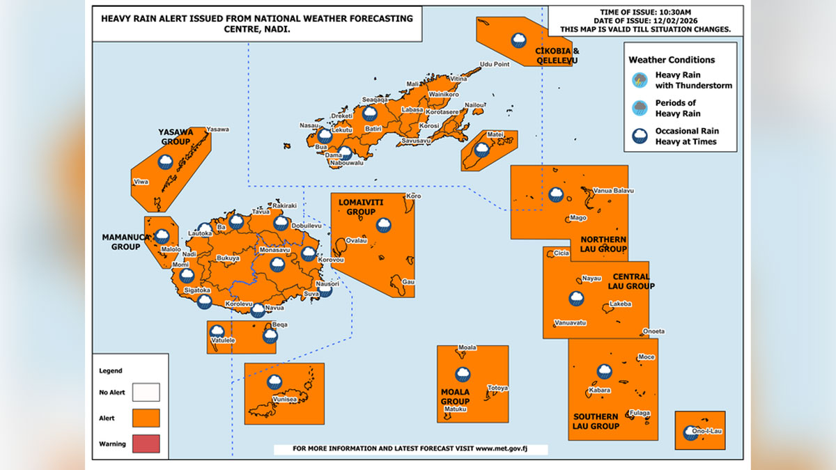 Meanwhile, the Nadi Weather Office says there will be occasional rain, heavy at times, and isolated thunderstorms over the Northern Division, Lau and Lomaiviti groups, Yasawa, Mamanuca, and the north-eastern parts of Viti Levu, including Tavua, Ra-Rakiraki, Naitasiri, and Tailevu North.