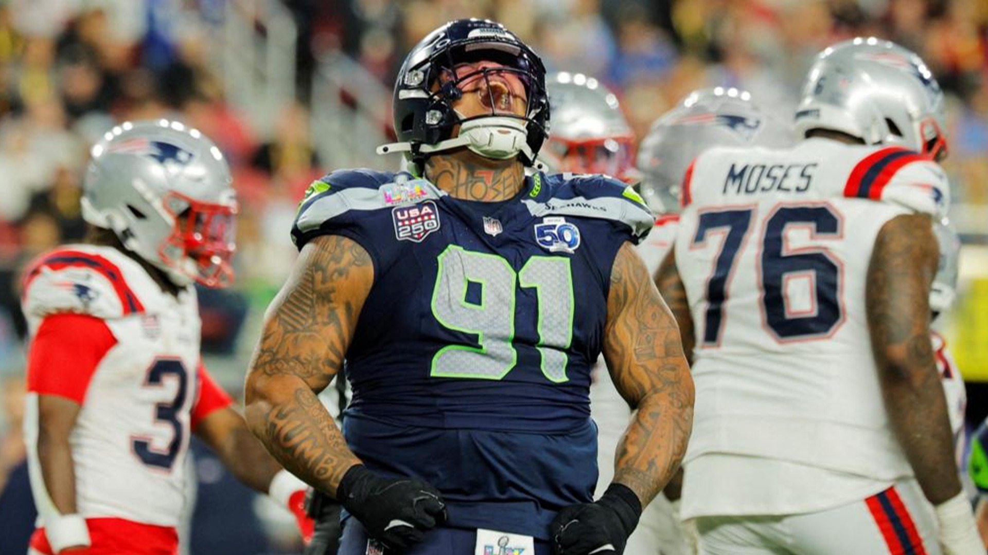 Linebacker Derick Hall led a ferocious pass rush that kept Pats quarterback Drake Maye off-balance for much of the contest, totaling two of the team's six sacks and forcing a fumble that led to Seattle's first TD of the contest.