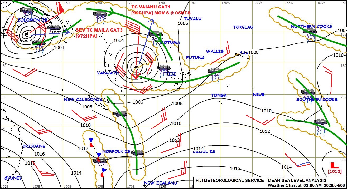 Tropical Cyclone Vaianu was located at 610 kilometres west-northwest of Yasawa and moving southwards at 9 kilometres per hour at 4am this morning.