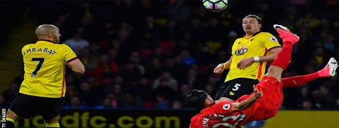The Reds midfielder, Emre Can met Lucas Leiva's delivery with a wonderful bicycle kick which flew into the top corner.