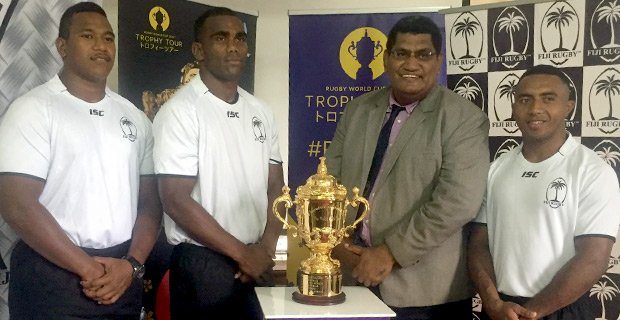 The prestigious William Webb Ellis Trophy made its fourth stop of the Rugby World Cup world tour at the Fiji Rugby Union office this morning.