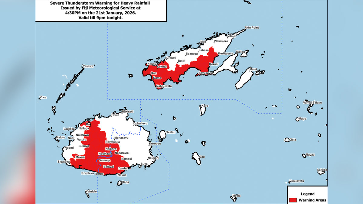 A Severe Thunderstorm Warning for Heavy Rain is now in force for interior and southern parts of Viti...
